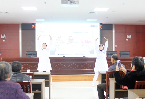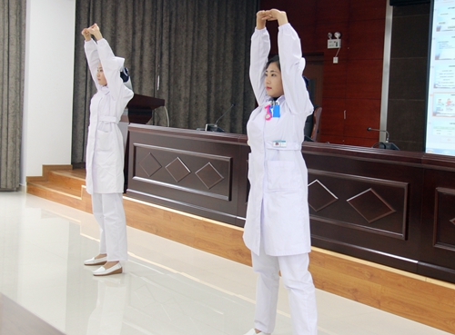 隨后由護(hù)士李嬌嬌、熊學(xué)琳為糖友們演示八段錦,八段錦對(duì)人體神經(jīng)系統(tǒng)、呼吸系統(tǒng)、循環(huán)系統(tǒng)、內(nèi)分泌系統(tǒng)等均有良好地影響。長(zhǎng)期鍛煉可以提高肌肉和組織對(duì)葡萄糖的利用率,使血中胰島素水平下降,并提高胰島素的敏感性,改善胰島素抵抗。此外,還可以增強(qiáng)體質(zhì),增加脂肪的消耗,直接或間接地控制血糖,從而有效地預(yù)防糖尿病發(fā)生。糖友們熱情高漲,紛紛拿出手機(jī)拍下視頻,都表示通過(guò)八段錦的鍛煉將使他們既能享受到運(yùn)動(dòng)的快樂(lè),又能收獲健康。