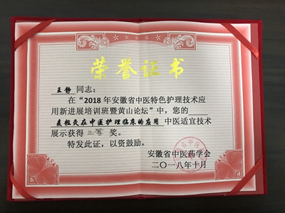 為深入學(xué)習(xí)貫徹黨的十九大精神,全面推動(dòng)“一法一綱要”施行,充分發(fā)揮中醫(yī)護(hù)理的特色與優(yōu)勢(shì),探索、創(chuàng)新、規(guī)范、推廣中醫(yī)護(hù)理技術(shù)臨床應(yīng)用,不斷滿足群眾日益增長(zhǎng)的中醫(yī)藥健康服務(wù)需求,安徽省中醫(yī)藥學(xué)會(huì)護(hù)理專業(yè)委員會(huì)于10月26-28日在合肥舉辦了安徽省中醫(yī)特色護(hù)理技術(shù)應(yīng)用新進(jìn)展培訓(xùn)班暨黃山論壇,我院康復(fù)科護(hù)士長(zhǎng)王靜的“麥粒灸在中醫(yī)護(hù)理臨床應(yīng)用”中醫(yī)護(hù)理適宜技術(shù)展示獲三等獎(jiǎng)。七病區(qū)護(hù)士熊繼環(huán)所撰寫的論文《中醫(yī)護(hù)理技術(shù)耳穴埋豆在慢阻肺病中應(yīng)用與優(yōu)勢(shì)》經(jīng)專家組評(píng)審,被選為大會(huì)壁報(bào)交流。此次大會(huì),為我院護(hù)士提供了展示自我的平臺(tái),同時(shí)也是一次向同行借鑒和學(xué)習(xí)的機(jī)會(huì),期待今后我院能有更多的護(hù)理骨干參加這樣的比賽和交流,鍛煉能力,展示風(fēng)采!(護(hù)理部 王媛媛)