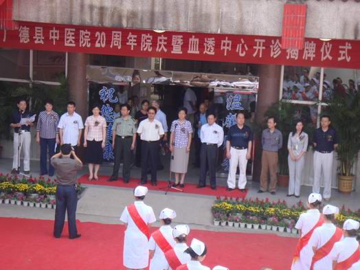 上午9時(shí),在副縣長馬群主持下,廣德縣中醫(yī)院建院二十周年暨血透中心開診系列慶典活動(dòng)在中醫(yī)院隆重開幕。出席儀式的領(lǐng)導(dǎo)和來賓有:安徽省中醫(yī)藥管理局局長董明培、安徽省衛(wèi)生廳婦社處處長沈敏祥、解放軍“九八”醫(yī)院院長高水清、安徽省省立醫(yī)院科教處處長葉山東博士、湖州市婦保院院長沈霞萍、廣德縣政協(xié)主席譚運(yùn)秀、廣德縣委常委政法委書記戴來永、廣德縣人大副主任陶崇林、廣德縣政府副縣長馬群、廣德縣政協(xié)副主席江曉華、廣德縣衛(wèi)生局副局長韓國衛(wèi),以及安徽省中醫(yī)藥管理局、安徽省省立醫(yī)院、解放軍“九八”醫(yī)院、湖州市婦保院等單位的其他領(lǐng)導(dǎo)和來賓們,以及兄弟縣市中醫(yī)院負(fù)責(zé)同志、縣直有關(guān)部門負(fù)責(zé)同志和各鄉(xiāng)、鎮(zhèn)、村醫(yī)護(hù)人員等等。各級(jí)領(lǐng)導(dǎo)親臨慶典現(xiàn)場(chǎng),給中醫(yī)院人以莫大的鼓舞。