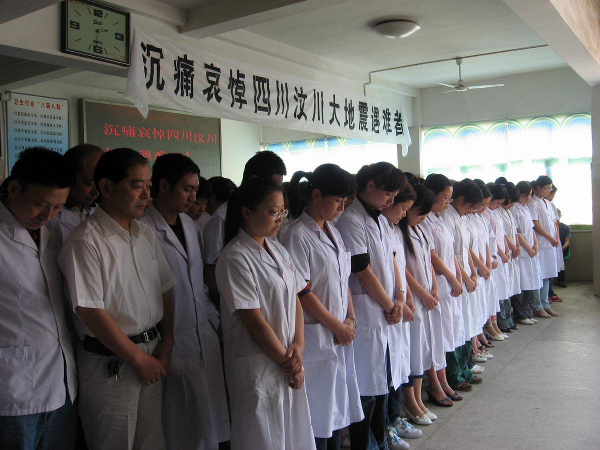 隨著救護車警笛的拉響,5月19日14:28分,中醫(yī)院候診大廳內一片寂靜,醫(yī)務工作者們集體默哀三分鐘,向汶川地震災區(qū)的遇難的同胞們表示哀悼。(徐林、陳靈香)