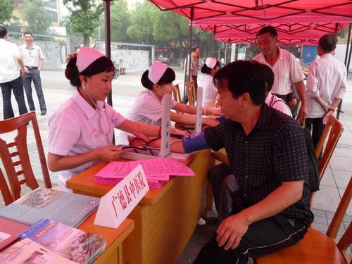 第九個世界獻血日即將到來,為了感謝獻血者的無私奉獻、廣泛宣傳無償獻血知識、動員全社會共同關注和參與無償獻血,6月12日,由市中心血站、縣紅十字會及獻血辦聯(lián)合主辦的慶!笆澜绔I血日”及無償獻血宣傳活動在夫子廟廣場隆重舉行。我院派出醫(yī)務人員積極參加此次活動,為廣大市民免費測血壓、宣傳獻血知識、提供醫(yī)療咨詢、發(fā)放健康宣傳資料等。本次義診活動得到了縣衛(wèi)生局的大力支持,袁順剛局長對本次義診活動進行了督導并給予了肯定。(陳希/圖、文)
