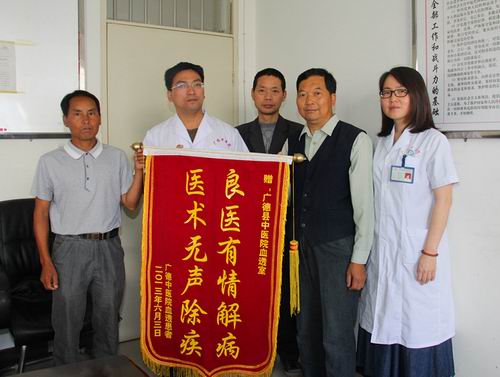 “血透室的同志們,感謝你們這幾年來(lái)對(duì)我們無(wú)微不至的關(guān)心、關(guān)愛(ài)和精心治療,在這里我們向你們說(shuō)一聲謝謝!道一聲辛苦了!”患者張勝平、桂行中、劉發(fā)強(qiáng)三人滿懷著感激之情來(lái)到縣中醫(yī)院,代表所有血液透析的腎病患者向血透室的醫(yī)護(hù)人員表示感謝,并送來(lái)一面繡有“良醫(yī)有情解病,醫(yī)術(shù)無(wú)聲除疾”字樣的紅色錦旗。