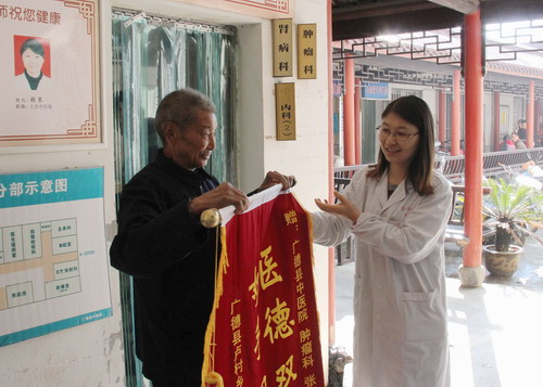 近日,我院腫瘤科張琴醫(yī)生收到病人贈(zèng)予的錦旗一面,上書“醫(yī)德雙馨,妙手回春”八個(gè)大字。據(jù)悉,送錦旗的熊大爺是盧村鄉(xiāng)丁沖村人,今年年初被查出患有食道癌,曾輾轉(zhuǎn)湖州等地求醫(yī)。后到我院腫瘤科求醫(yī),張琴醫(yī)師根據(jù)熊大爺?shù)牟∏,量身為他制定了中藥加化療相結(jié)合的方案,如今熊大爺已經(jīng)基本康復(fù)。接受采訪時(shí),熊大爺說,現(xiàn)在他對張琴醫(yī)師特別信賴,對以后的康復(fù)也很有信心,并表示回鄉(xiāng)后一定要告訴大伙中醫(yī)院有一位好醫(yī)生。愊/圖、文)