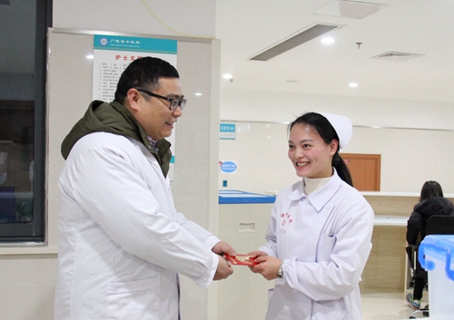 當(dāng)晚7時(shí)30分,游昌林院長帶領(lǐng)院班子成員、辦公室、醫(yī)務(wù)科、工會(huì)等職能科室負(fù)責(zé)人深入到醫(yī)院各科室,代表全體員工向仍堅(jiān)守在崗位上的醫(yī)護(hù)人員拜年,給他們送去了慰問金,并致以親切的問候和良好的祝愿。