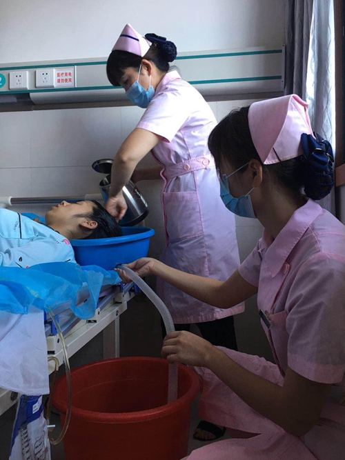“吳女士,您住院好幾天了,頭癢了吧?讓我給您洗個(gè)頭好嗎?”前段時(shí)間,我科吳女士因病情需要長期臥床休息,五病區(qū)護(hù)士長李鴻主動(dòng)提出為患者洗頭。護(hù)士長查房時(shí)在與家屬的交流中了解到,生活中的吳女士非常注重自己的外在形象,喜歡把自己打扮的漂漂亮亮,但是因?yàn)樾袆?dòng)不方便,便沒有洗頭,炎炎夏日,出汗很多,長期躺在床上使得吳女士頭發(fā)凌亂不整潔。