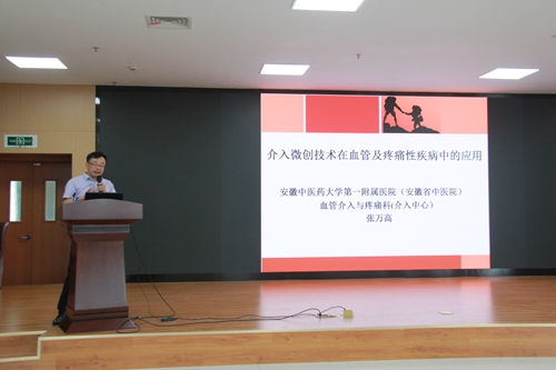 培訓(xùn)會(huì)在中醫(yī)院六樓會(huì)議室舉行,呂維富教授詳細(xì)主講了《介入放射學(xué)在臨床中的應(yīng)用》,并就介入放射學(xué)的概念、應(yīng)用范疇、應(yīng)用優(yōu)點(diǎn)以及手術(shù)所需的器材進(jìn)行了仔細(xì)的分析、講解,并通過(guò)PPT放映了大量手術(shù)事例。張萬(wàn)高教授講解了《介入微創(chuàng)技術(shù)在血管及疼痛性疾病中的應(yīng)用》,他首先介紹了血管和疼痛性疾病發(fā)生的誘因、類別和癥狀,并主講了血管和疼痛性疾病的微創(chuàng)介入治療的應(yīng)用范圍。