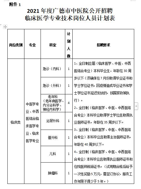 附件1.《2021年度廣德市中醫(yī)院公開招聘臨床醫(yī)學(xué)專業(yè)技術(shù)崗位人員計劃表》
