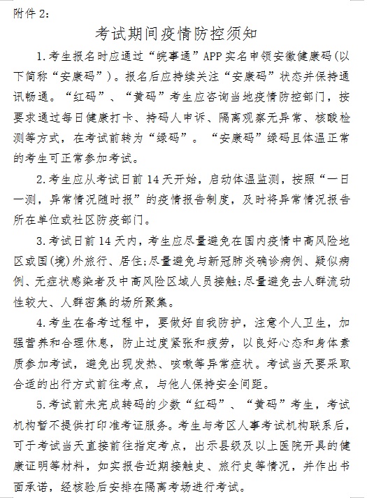 報考人員報名前,應(yīng)通過“皖事通”APP實名申領(lǐng)“安康碼”。報考人員報考前請認真閱讀《考試期間疫情防控須知》(附件2)。報考人員提供的信息必須與本人實際情況、報考條件和所報考的崗位要求相一致。凡弄虛作假通過資格審查,其實際情況與報考條件規(guī)定不符的,一經(jīng)查實,即取消考試、聘用等資格。