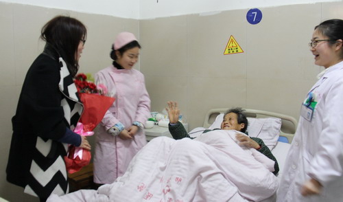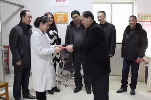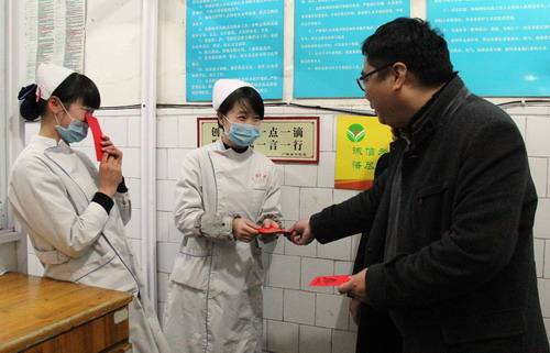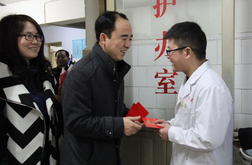 2015年除夕之夜,萬家團圓之際,迎著濃濃的年味,周永富院長帶領辦公室、醫(yī)務科、總務科等職能科室負責人深入到醫(yī)技和臨床科室,慰問了春節(jié)仍在崗位辛勤工作的職工,同時還探望了春節(jié)留院的病人,為他們送去了新春的美好祝愿。